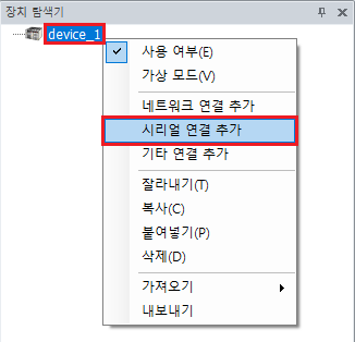 1) 장치 탐색기 → 새 장치 추가 → 시리얼 연결 추가