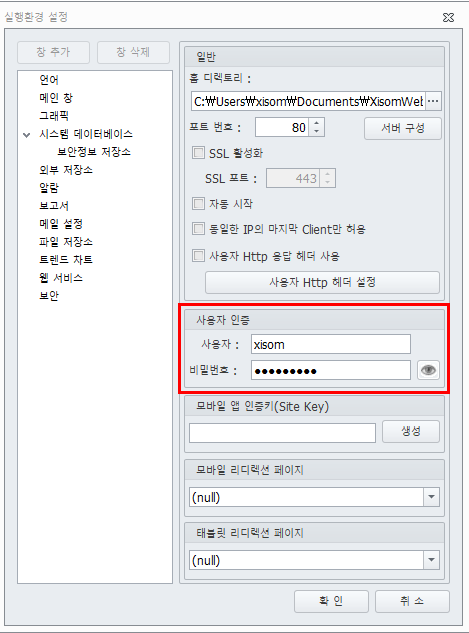 - 실행환경설저 -> 웹 서비스 에서 사용자 인증의 비밀번호 숨김처리